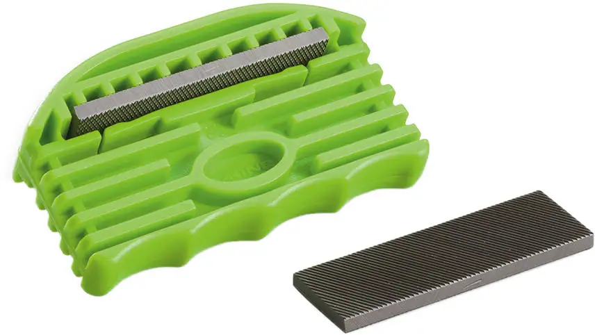 Lima di precisione per lamine. Gli angoli possono essere usati sulle lamine laterali, dove c’è più bisogno di affilare rispetto alle lamine sulla base. Questo doppio attrezzo vi offre due angolazioni, rispettivamente di 90° o 88°. La presa è molto confortevole e le zigrinature vi permettono di impugnarla saldamente. Lima extra inclusa.