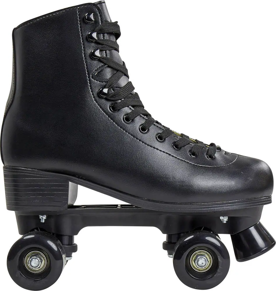 Pattini a rotelle classici in nero, prodotti in Italia dalla Roces, adatti per pattinaggio e divertimento. Tallone alto e telaio in plastica. L’altezza e la lingua sono in PVC.